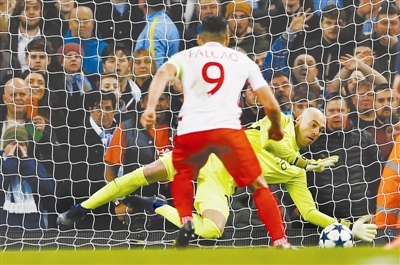 2月21日,曼城队门将卡瓦列罗 (后)扑出摩纳哥队球员法尔考的点球。当日,在2016-2017赛季欧洲足球冠军联赛八分之一决赛首回合比赛中,曼彻斯特城队主场以5比3战胜摩纳哥队。 新华社/路透
