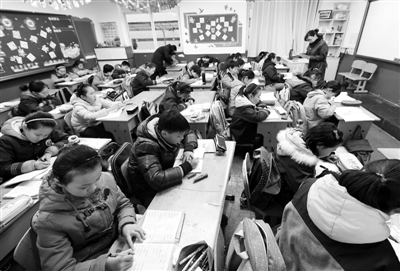 2月20日,南京市游府西街小学五年级班“弹性离校”学生在复习功课。