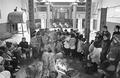 在江西省上高县蒙山镇抗头村的祠堂里,一位老师在给孩子们讲述“孟母三迁”的传统故事(2月22日摄)。