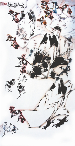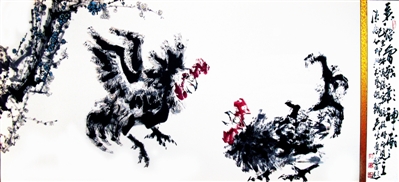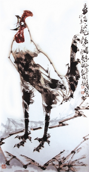 吴东魁先生多年来执笔挥毫抒写着心中的雄鸡。当我们浏览吴东魁艺术馆一幅幅笔墨生活,昂然威立的雄鸡顿时触动读者内心的激情,画面上的鸡或站立、或回首、或俯视,无不充满了斗志与激情,呼之欲出,雄气勃发。吴东魁先生笔下的雄鸡,既不同于齐白石的悠闲,亦不同于徐悲鸿的亢奋,也不同于王雪涛的亲切,他所绘雄鸡是立足于鲁西南人文精神背景下,表现出勤劳勇敢、威武不屈、百折不挠的一种抗争精神。他把家乡的斗鸡贯串于笔墨情趣之中。吴先生所画雄鸡以夸张变形的手法来塑造形象,用大块笔墨突出雄鸡的霸气与精神,高冠红羽,大眼点精。喷张的喉咙,铁一般的双爪,突出形与神的艺术张力,在大胆渲染的同时,又细微收拾小节,以线条和墨块形成了力与量的表达。
