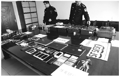 警方查获的伪基站设备及各类作案工具。