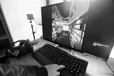 上海首创VR阅读书店,透过电脑屏幕可以看到VR眼镜里的画面。 柏可林 摄/东方IC