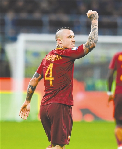 2月26日,罗马队球员纳英戈兰庆祝进球。当日,2016-2017赛季意大利足球甲级联赛第26轮的一场比赛中,罗马队客场以3比1战胜国际米兰队。