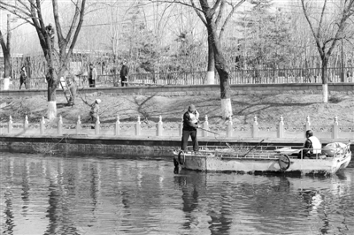 2月27日,园林工人在北京市海淀区南长河畔为河两岸的柳树修剪枝头。