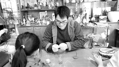 沈阳市新华购书中心三楼泥人周工作室里,周亮正在给4个孩子上课,教他们捏泥人。