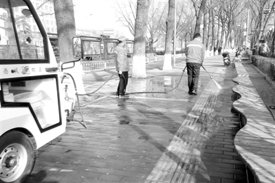 2月27日,北京环卫工人正在冲洗前门西街便道上的污渍,以清洁优美的环境迎接全国“两会”召开。