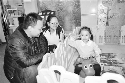 在候车大厅一旁的儿童乐园,一名5岁的女孩在玩耍,身边的父母脸上露出甜蜜的微笑。今年,太铁局榆次站倾心打造“亲情港湾”服务品牌,并在候车大厅设立了母婴候车室,为小孩设了一处儿童乐园,并特意配置了儿童必备品。(张永庆)
