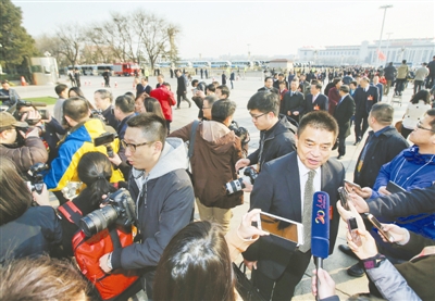 3月4日上午,十二届全国人大五次会议举行预备会议。在人民大会堂门口,早早到场的刘永好代表接受记者采访。期间,宗庆后代表从旁边经过时,被记者追访。今年两会,两位企业家代表都关注着中国的实体经济以及企业的转型升级,希望能为中国经济发展提供良方。