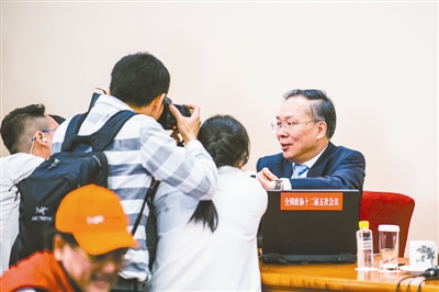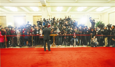3月5日,十二届全国人大五次会议开幕前,农业部部长韩长赋在“部长通道”接受记者采访,当天共有11位部长亮相。从过去的“围追堵截”到现在的“主动发声”,部长通道正在成为向世界展示开放自信中国的重要窗口。本报记者 杨登峰 摄