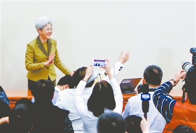 3月4日,十二届全国人大五次会议举行首场新闻发布会。会后,大会发言人傅莹向记者挥手致意。本报记者 杨登峰 摄