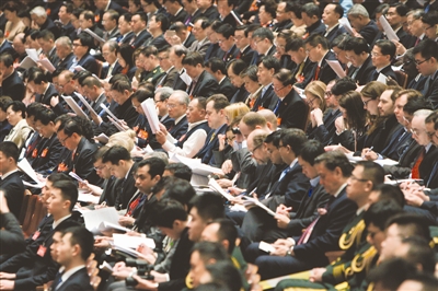 3月5日,北京人民大会堂,列席十二届全国人大五次会议的全国政协委员和旁听的外国驻华使节认真研读政府工作报告。本报记者 杨登峰 摄