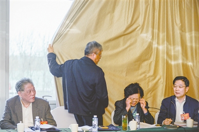 3月5日下午,在工会界别分组讨论会上,为了给摄像师创造一个良好的采访环境,政协委员李志军起身拉住窗帘。