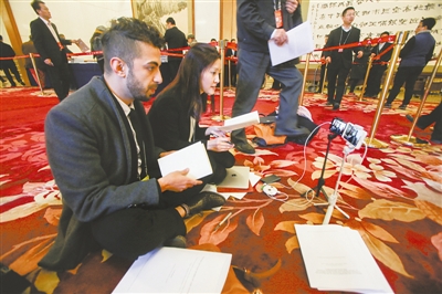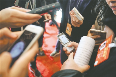 拿到政府工作报告的记者在第一时间用手机进行直播报道。
