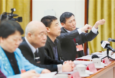 3月5日下午,十二届全国人大五次会议安徽代表团全体会议上,全国人大代表、安徽省农业科学院副院长赵皖平在审议政府工作报告时举起胳膊给大家打比方说:撸起袖子加油干,首先要解开扣子。对于科研人员,就是要减少对他业务上的行政干预,给他更大的自主空间。本报记者 杨登峰 摄