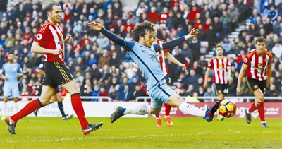 当日,在2016-2017赛季英格兰足球超级联赛第27轮比赛中,曼城队客场以2比0战胜桑德兰队。 新华社/路透