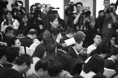 3月2日,新闻发布会上提问的女记者。本报记者 王伟伟 摄