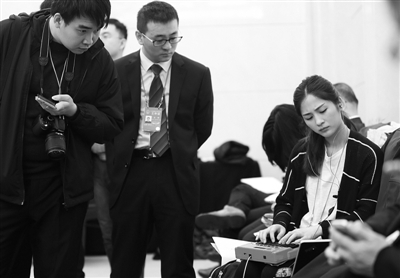 “三八”国际劳动妇女节来临,参加两会的女代表、女委员们在会场内忙碌着,而会场外的女记者、女工作人员同样尽职尽责,她们在工作中留下一个个靓丽的身影。