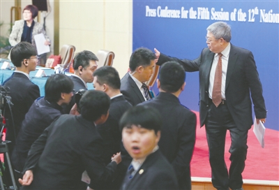 3月7日,十二届全国人大五次会议新闻中心在梅地亚中心多功能厅举行记者会,国务院扶贫办主任刘永富就“脱贫攻坚工作”的相关问题回答中外记者的提问。图为记者会结束后,刘永富边走边回答记者的追访。