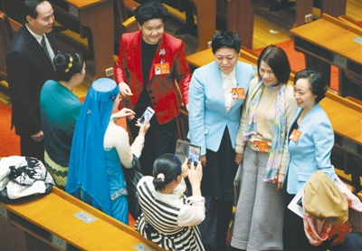 3月8日下午,十二届全国人大五次会议第二次全体会议结束离场时,几位代表上前与珠海格力电器董事长董明珠代表(右二)合影。今年两会上,董明珠代表表示:企业要想掌握核心技术,最关键的一点是解决人才问题。为了留住人才,她将会继续给员工涨薪水、建房子,与劳动者共享创新成果,提升员工的幸福感。 本报记者 杨登峰 摄