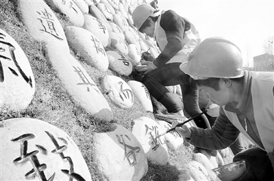 3月7日,河南省济源市,工人们正在建设《道德经》石刻墙。从去年12月以来,王屋山景区在王屋山道境广场建设《道德经》石刻墙。苗秋闹 摄/视觉中国