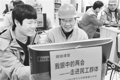 当日,江苏科技大学志愿者来到镇江市七里甸街道万科社区“农民工网络学堂”,指导辖区建设工地的进城务工人员通过电脑和智能手机上网了解全国两会新闻,为民工兄弟们解读有关农民工保障、医疗及子女教育等内容。凡言 摄/视觉中国