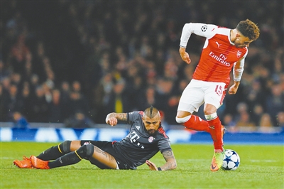 3月7日,阿森纳队球员张伯伦(右)与拜仁慕尼黑队球员比达尔在比赛中拼抢。
