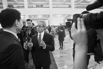 全国政协委员周明伟在接受一位外国记者的采访 。