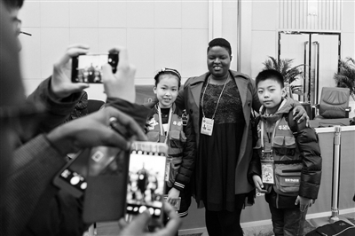 新闻发布会结束后,一名来自非洲的女记者与采访两会的小记者一同合影。
