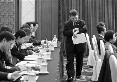 3月12日下午,在十二届全国人大五次会议广东代表团全体会议上,全国人大代表、广东省检察院检察长郑红发完言后边看表边走回座位。