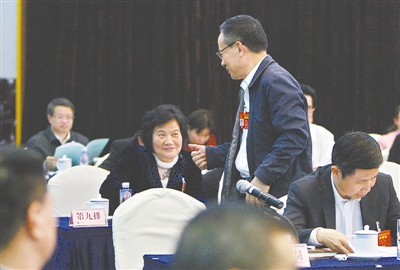 3月12日,在全国两会广东代表团全体会议上,全国人大代表、广东银鹏动力设备有限公司技术总监翁一岚在发言中说:近两年,大量对债务不知情、不同意、未共享利益的无辜受害人,在离婚后发现自己是“被负债”。她建议对《婚姻法》司法解释(二)第二十四条进行修改,有效保障妇女合法权益。会后,一位代表对她的发言竖起大拇指表示赞赏。 本报记者 杨登峰 摄