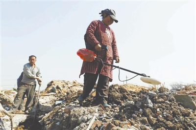 3月14日,在浙江嘉兴市东栅一处拆迁工地上,来自四川资阳的农民工刘扬国带着妻子蓝兴碧利用金属探测仪寻找地下金属。这种探测器可探测地下1.5米深以内的所有金属物品。照真达俗 摄/视觉中国