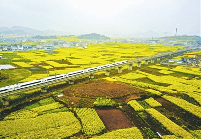 近日,贵州安顺油菜花开,高铁列车穿行其间,构成一幅幅美丽图画。新华社发(卢维 摄)