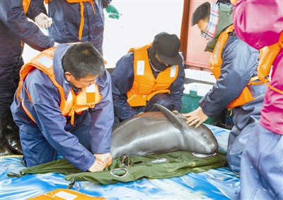 3月16日,中科院水生生物研究所工作人员在鄱阳湖都昌水域对江豚进行体检。