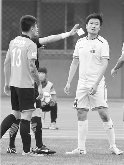 国内足球职业联赛的赛场纪律亟待进一步规范,图为大连超越队球员胡兆军(中)在本赛季中甲联赛中被裁判出示黄牌。 新华社记者贺长山摄