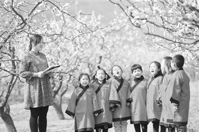 图为3月16日,山东省邹平县黄山街道郎君幼儿园的孩子们在老师带领下,在杏园朗读学习国学经典《大学》内容。