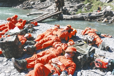 3月17日,连续昼夜奋战的武警甘孜森林支队官兵就地休息。