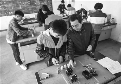 3月19日,饶阳县职业技术学校电子电工专业的老师在指导学生。
