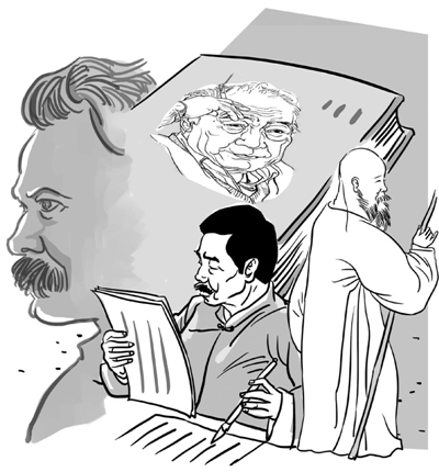 尼采留在诗集封面上的样子,是一蓬络腮胡子和鹰隼一样的眼睛,眼窝凹得很深,说明他睡眠很差,日思夜想所致。我在年轻时曾经临摹过尼采的肖像,只有旺盛的胡须和犀利的眼神,其他别无长物。