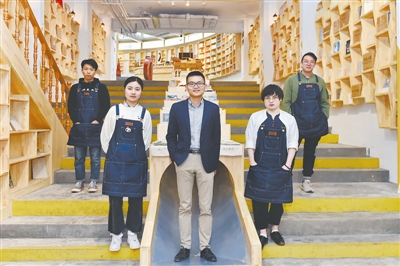 3月20日,太原市“岛上书店”创办人卢虹任(中)与团队成员在书店内合影。