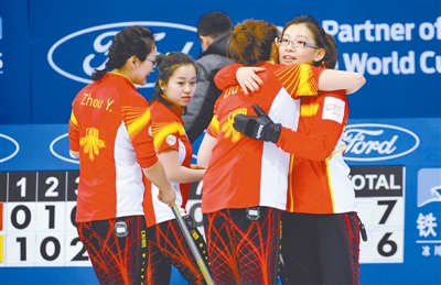 3月20日下午,中国队在世界女子冰壶锦标赛第4轮比赛中,以7比6战胜韩国队,赢得开赛以来的首场胜利。图为中国队相互庆贺。本报记者 许之丰 摄