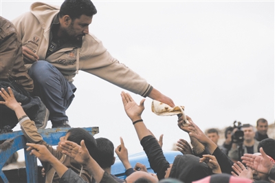 3月19日,在伊拉克摩苏尔附近,救援人员在哈马姆阿利勒营地向人们发放救济食品。哈马姆阿利勒营地位于摩苏尔以南大约20公里,是多数摩苏尔平民逃亡的重要中转站。新华社记者 魏玉栋 摄
