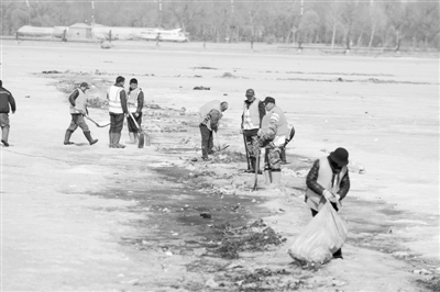 3月21日,在哈尔滨市防洪纪念塔附近的松花江冰面上,20多名环卫工人正在清理散落在江面上的垃圾。据了解,这些垃圾都是冬季里来松花江上游玩的游客们丢弃的,如不及时清理,这些垃圾将对河水造成污染。阳阳 摄/视觉中国