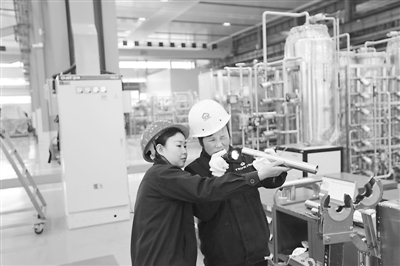 赵小燕(左)指导雷金娥观察焊缝。张飞 摄