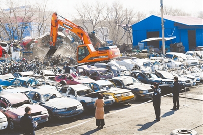 当日,黑龙江省哈尔滨市交警部门开展交通整治行动,集中销毁341台黄标车和无路权车。