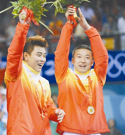 图为马琳与王皓在北京奥运会上拿到团体金牌。视觉中国 供图