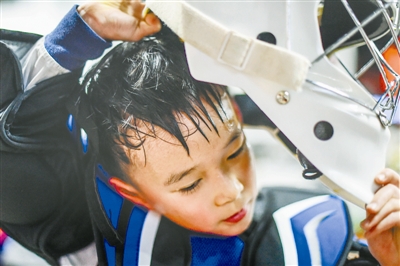 图为3月10日,广州东山培正小学冰球队守门员“大白”廖梓轩训练后大汗淋漓。