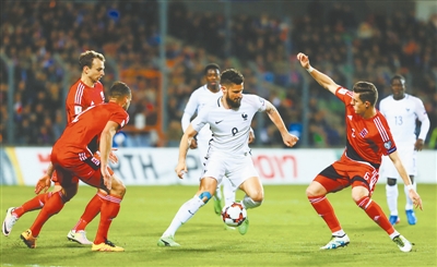 3月25日,法国队球员吉鲁(前中)在比赛中突破。