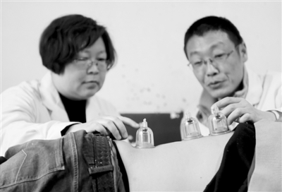 近日,周末团聚的向永超(右)、熊佳春夫妇一边给病人拔罐治疗,一边交流医术。