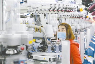 诸暨市大唐袜业小镇的袜企员工正在智能袜机生产车间赶制订单。郭斌 摄/中新社