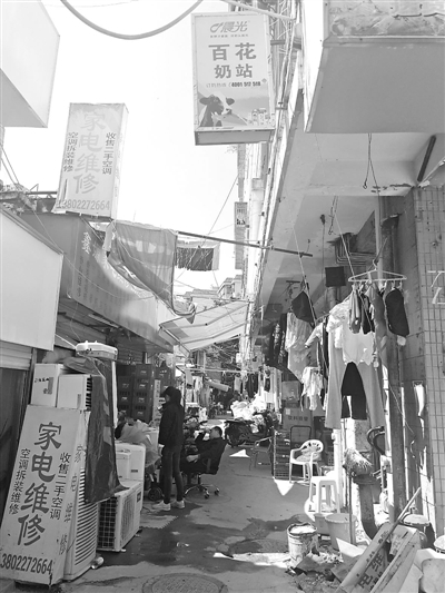 狭窄的过道,道路两边是林立的楼房,抬头看,两侧阳台上晾晒满的衣服便遮住了这一线天。穿过茂密的楼房群,过了一个转角,视线变得豁然开朗——这里散落着家电维修站、奶站、网吧和超市。
